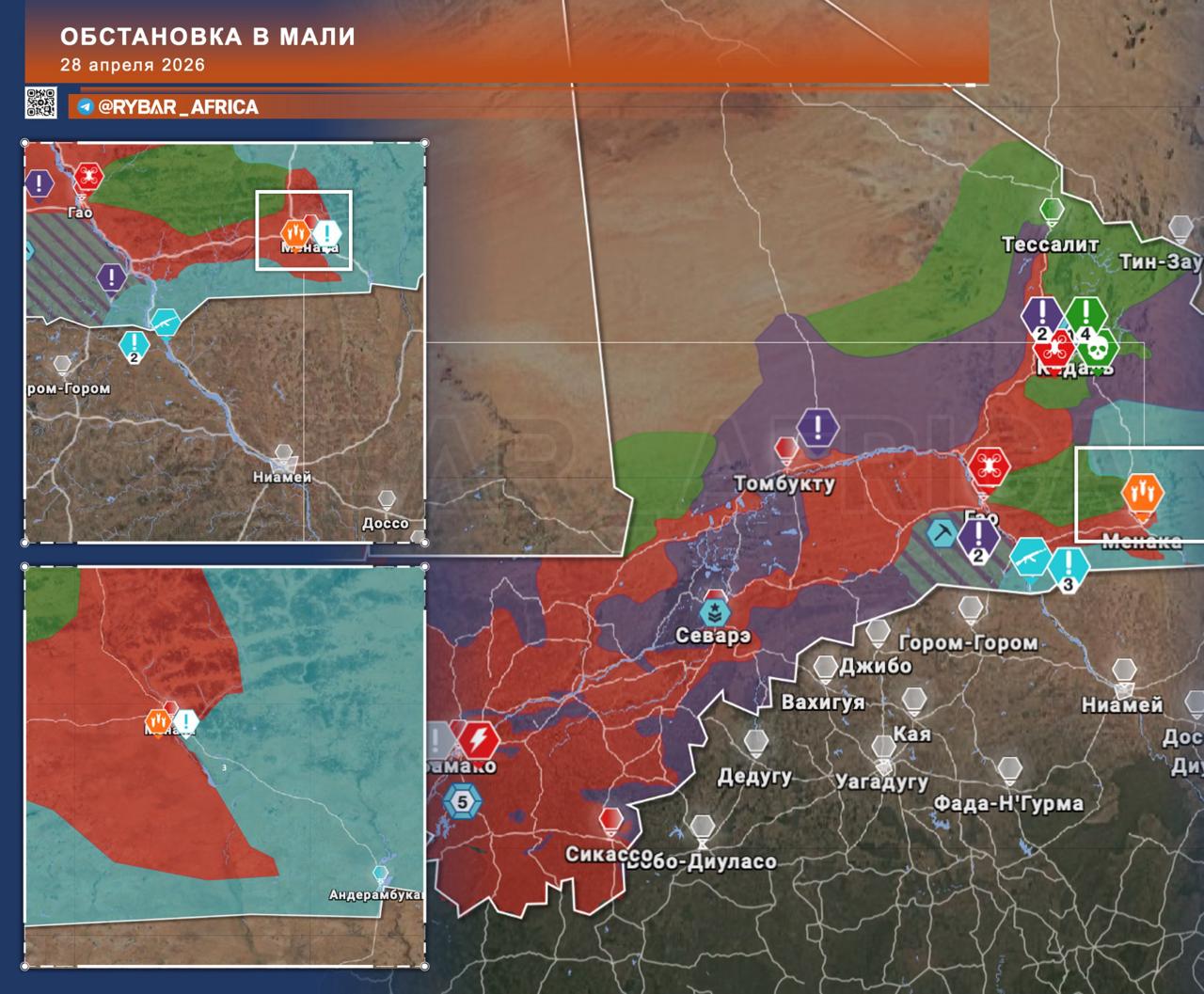 Боевики из «Исламское государство в провинции Сахель» предприняли попытку продвинуться к Менаке. На фоне этих сообщений армия Мали и «Африканский корпус» нанесли этим утром авиаудары по позициям боевиков на подступах к городу.
