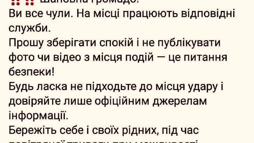 Удары пришлись по объектам в районе н.п. Куликовка. Глава громады Юлия Постернак призвала жителей «не снимать и не публиковать фото и видео с места происшествия».
