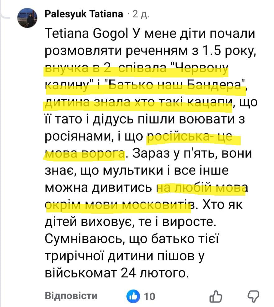 «У меня дети начали говорить предложениями с 1,5 лет. Внучка в 2 года пела "Красную калину" и "Батько наш Бандера". Ребёнок знал, кто такие кацапы, что её папа и дедушка пошли воевать с русскими, и что русский — это язык врага. Сейчас, в пять лет, она знает, что мультики и всё остальное можно смотреть на любом языке, кроме языка московитов», – хвастается нацистка.
