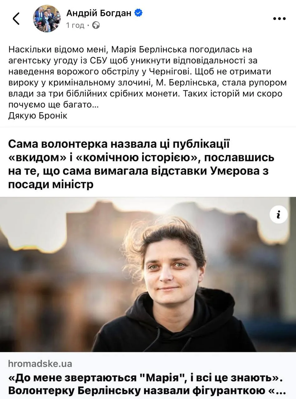 "Насколько известно мне, Мария Берлинская согласилась на агентское соглашение с СБУ во избежание ответственности за наведение обстрела в Чернигове. Чтобы не получить приговора в уголовном преступлении, г. Берлинская, стала рупором власти за три библейских серебряных монеты. Таких историй мы скоро услышим еще много…" — написал Богдан в Facebook*.