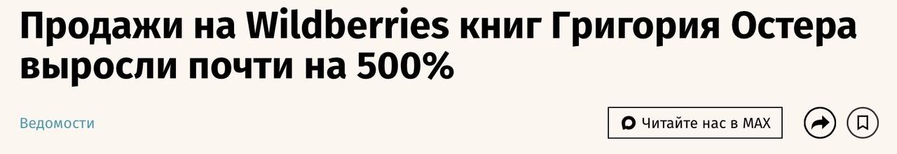 Олег Царёв: Продажи на Wildberries книг писателя Григория Остера с 21 по 26 апреля увеличились почти на 500% в натуральном выражении по сравнению с таким же периодом 2025 г. И на 220% относительно начала месяца